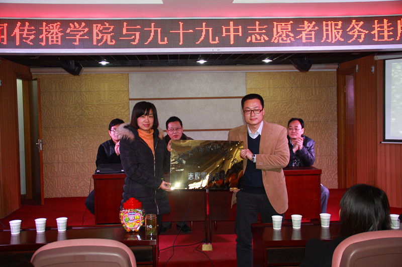 请郑州大学新闻与传播学院团委书记杜老师向郑州九十九中XXX授志愿服务基地牌。