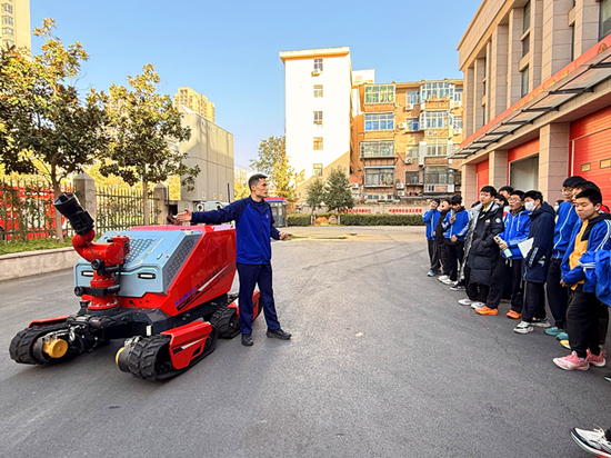 活动伊始,消防指战员带领师生们先后参观了装备库区与消防车展示区。在展示现场,指战员结合校园消防安全需求,为学生们进行了系统性的装备讲解。从承担高层灭火任务的高层供水车,到应对各类突发险情的抢险救援车,每一辆特种车辆的功能分工都做了细致讲解;当云梯消防车的升降梯缓缓升起,伸展至高空时,学生们不禁发出惊叹声,直观感受到了消防装备的强大威力。此外,造型新颖、功能先进的消防灭火器机器人更是成为现场“焦点”,指战员详细演示了机器人的操作原理与适用场景,大家纷纷围着指战员踊跃提问,从“机器人能扑灭哪些类型的火灾”到“消防服为什么这么厚重”,问题层出不穷,指战员们耐心逐一解答,现场学习氛围十分浓厚。