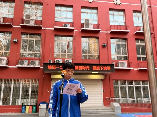 12月8日清晨,伴随着庄严的国歌,五星红旗冉冉升起。九年级学生代表张瀚文以《青春燃烽火 热血筑华章》为题发表国旗下演讲。他深情回顾“一二・九”运动中爱国青年为民族独立挺身而出的壮阔历史,结合新时代青年的使命担当,号召同学们以先辈为榜样,将爱国情怀转化为学习动力,用青春热血书写民族复兴的崭新篇章。