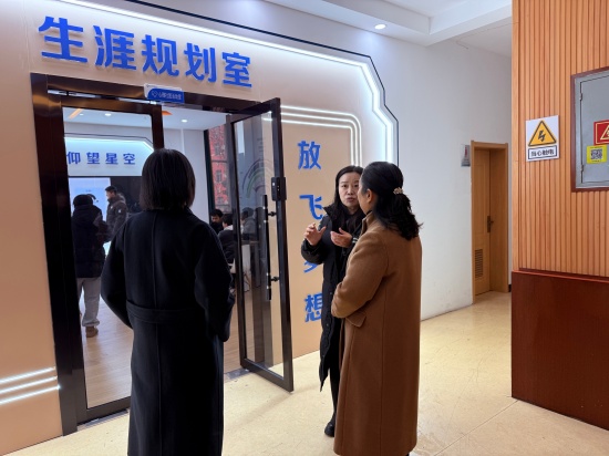 考察团一行实地参观学校生涯规划中心、法治教育中心、教育科研中心及社团活动室、教学生活区域。在各功能场馆内,考察团成员认真聆听教师讲解,详细了解各中心的职能定位、日常开展的特色活动以及教学意义。作为省级优秀法治宣传教育基地,学校法治教育中心配备的现代化教学设备、编写的针对性校本课程,以及将普法教育与心理健康教育深度融合的创新做法,得到了考察团的高度关注。随后,考察团走进教学生活区,实地调研学校准军事化宿舍管理模式。从内务整理的统一规范,到作息时间的科学安排,再到独具特色的“学生成长银行”奖励机制,对学校精细化的管理举措给予高度认可。