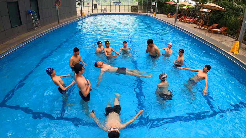 该次课程分为溺水体验10秒钟、感受莽撞救人的风险、教紧急自救游泳姿势:仰泳及水母漂泳、蛙泳技能的简单学习、小组游泳比赛五个环节。